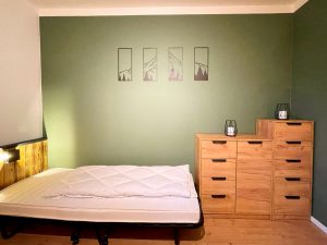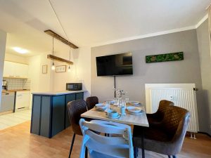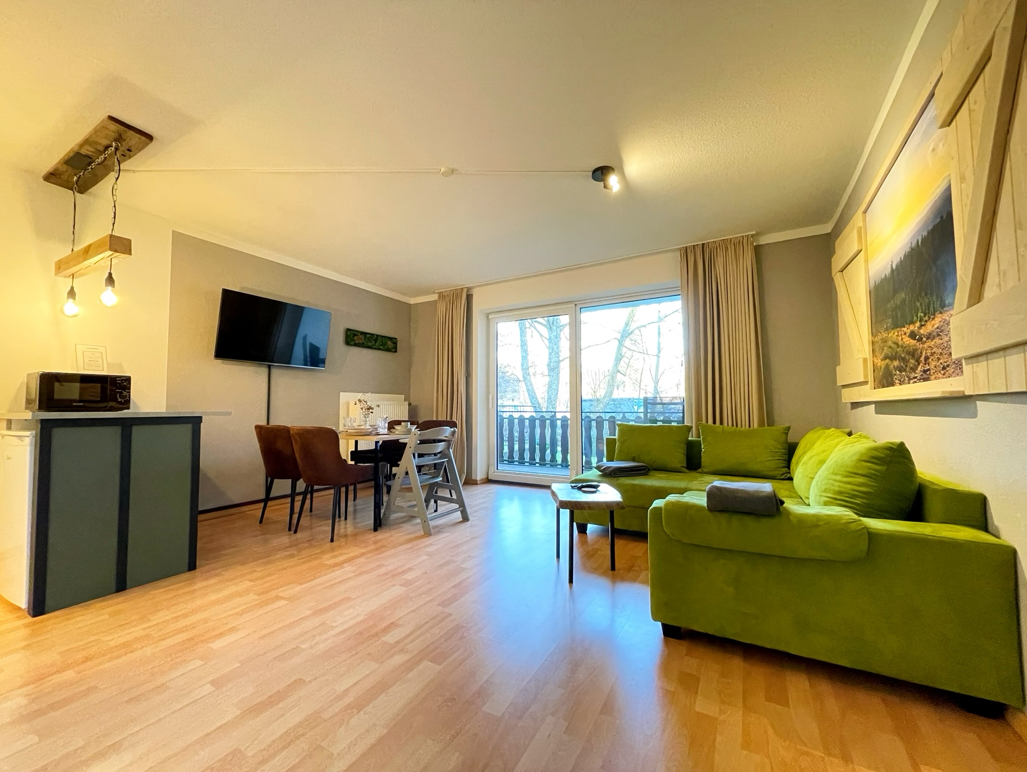 Wohnkomfort & Ausstattung:Das Waldpartment verfügt über ein Schlafzimmer mit gemütlichem Doppelbett, ein Einzelbett und eine Schlafcouch im Wohnbereich – ideal für Familien oder kleine Gruppen.Die Küchenzeile ist komplett ausgestattet und bietet alles für deinen Aufenthalt: Herd, Kühlschrank, Mikrowelle, Toaster, Wasserkocher, Kaffeemaschine, Geschirr und Besteck.Im modernen Badezimmer steht eine Dusche zur Verfügung.