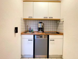 - Küchenzeile mit Herd, Kühlschrank, Mikrowelle, Toaster, Kaffeemaschine & Wasserkocher